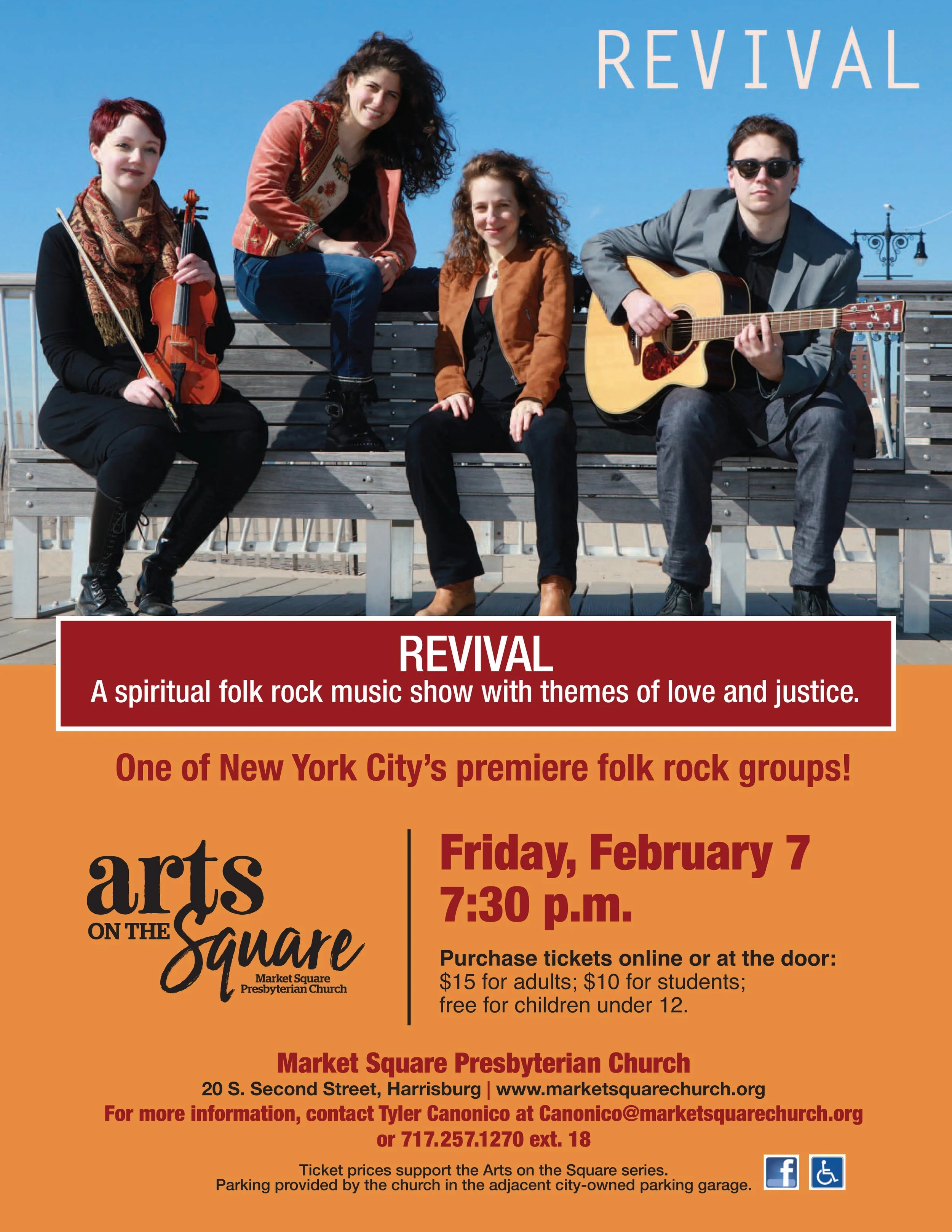“Tremendous evening… Hugely talented singers, storytellers, instrumentalists, and brilliant writing. Great rapport and repartee with the audience. Deeply poetic and compelling songs reflecting on Hebrew Scripture passages and stories. This ensemble is first-rate and it was one of our loveliest Market Square evenings. So glad these folks made the trip from NYC to Harrisburg!”
