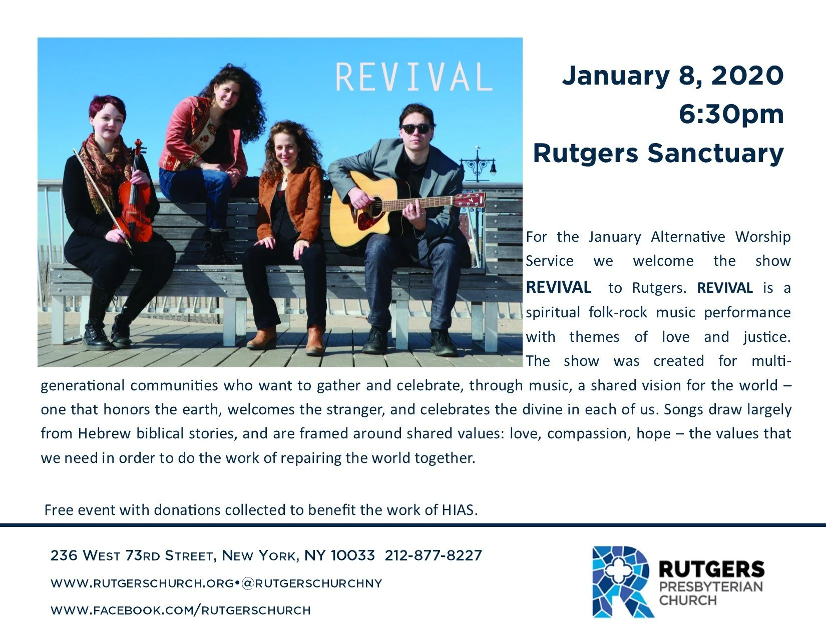 Revival is a spiritual folk-rock music show with themes of love and justice. After premiering at WOW Café Theater in New York City in December of 2016, Revival was performed in numerous venues around NYC and across the Northeast.